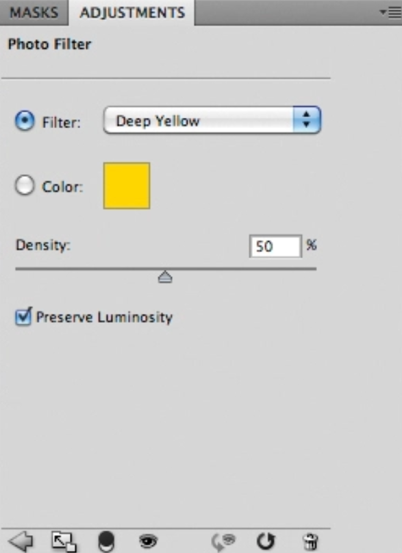 Layer > New Adjustment Layer > Photo Filter로 이동하십시오. 50%의 강도를 가진 필터에 깊은 노란색 사용해주세요. 이 레이어를 '딥 옐로우'라고 부릅니다. 그런 다음 다른 모든 레이어가 병합된 새 레이어를 생성해주세요. (Cmd/Ctrl + Alt + Shift + E). 그런 다음 반지름에 15픽셀의 필터 > 블러 > 가우시안 블러를 사용합니다. 이 레이어의 혼합 모드를 Screen으로 변경하고, 불투명도를 60%로 변경합니다.