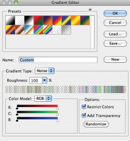 Gradient1'이라는 다른 레이어를 추가한 다음 Gradient 도구(Gradient Tool)를 사용하여 Gradient Sample을 클릭하여 Gradient Editor를 여십시오. 유형에서 소음으로, 조도를 100%로 변경하고 색상 제한 및 투명도 추가를 선택하십시오. 이제 Angle Gradient 스타일을 선택하고 영상의 오른쪽 중/상단에서 오는 광선 효과를 생성하십시오. 그 후 Image > Adjustments > Desatragate로 가서 Filter > Blur > Gausian Blur로 간다. Radius 반지름에 15픽셀을 사용하십시오.