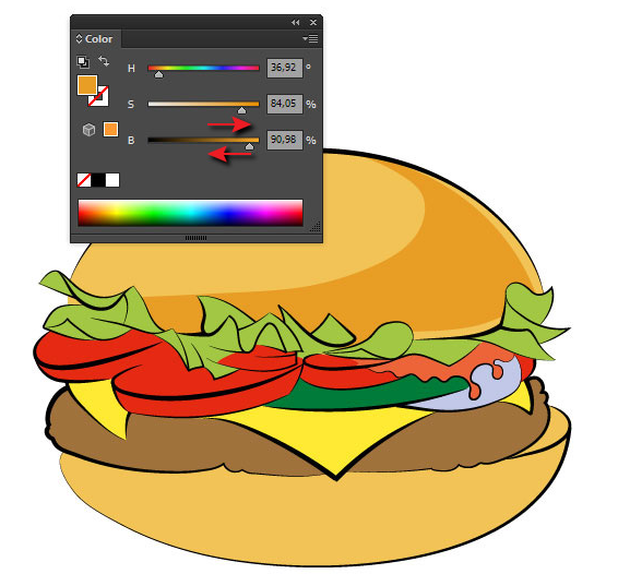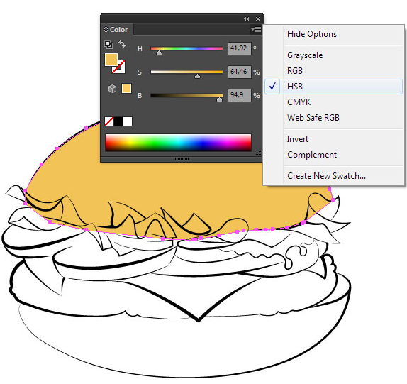 햄버거의 채색으로 진행하십시오. 외곽선이있는 레이어를 잠급니다. 새 레이어를 만들어 레이어 패널의 윤곽선 아래로 옮깁니다. 여기서는 색상 채우기로 객체를 만듭니다. 이러한 개체를 만드는 가장 빠른 방법은 연필 도구를 사용하는 것입니다. 먼저 나머지 아래에있는 요소를 색칠하십시오. 이 단계에서는 단색 만 사용하십시오. HSB 색상 모드를 사용하면 원하는 음영을 빠르게 얻을 수 있습니다. 색상 패널에서 이 모드를 선택하십시오.