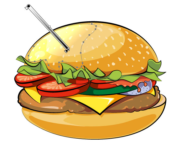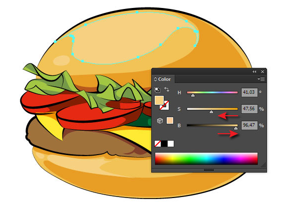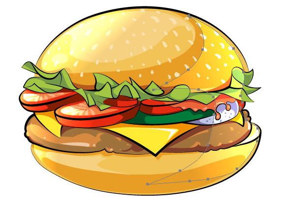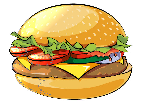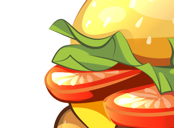이전 단계에서 설명한 기술을 사용하여 만화 스타일 벡터 버거의 왼쪽 조명 부분에 강조 표시를 만들고 음영 처리 된 부분에 반사를 만듭니다.