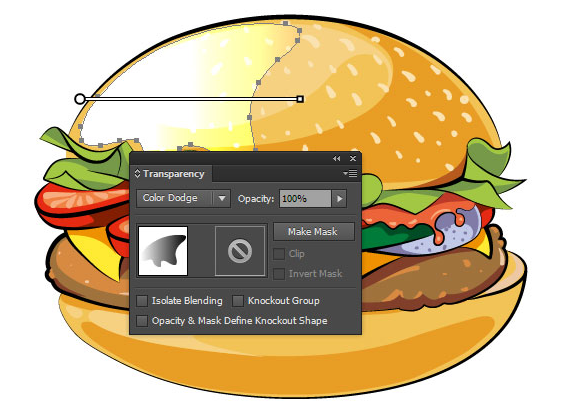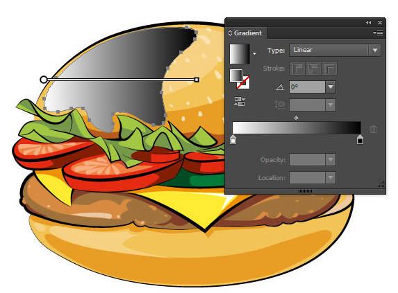더 많은 볼륨을 추가하려면 하이라이트를 늘리십시오. 버거의 조명 표면에 모양을 만들고 흰색에서 검은 색으로 선형 그라디언트로 채웁니다.