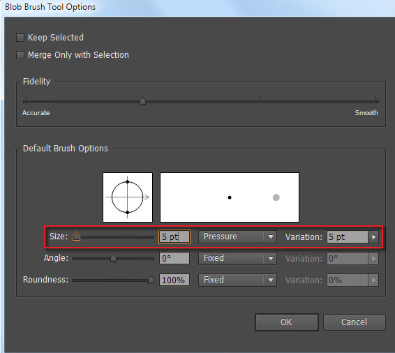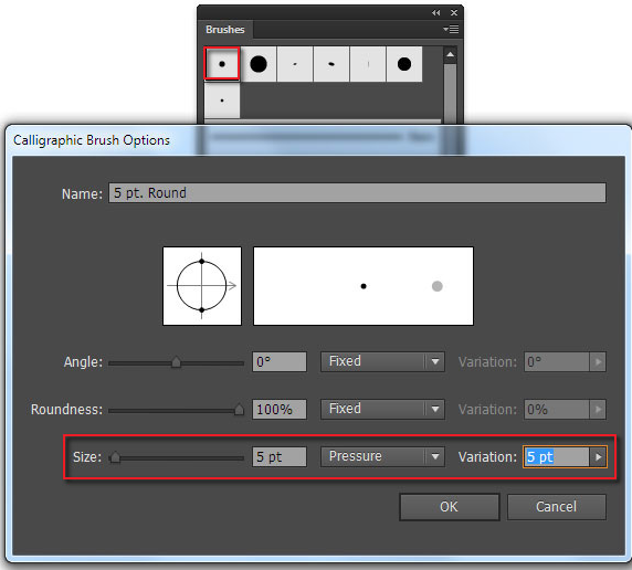 이 도구로 만든 윤곽선을 쉽게 편집 할 수 있으므로 페인트 브러시 도구를 사용하는 것이 좋습니다. 도구를 조정하려면 브러쉬 패널 ( 창> 브러쉬 )을 열고 둥근 붓글씨 브러쉬의 축소판을 두 번 클릭하십시오. 열린 대화 상자에서 브러시 크기 압력 옵션을 선택하고 크기 및 변형 값을 설정하십시오.