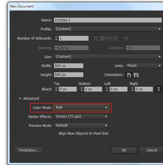 만화 스타일의 벡터 자습서를 시작하려면 Adobe Illustrator를 시작한 다음 파일> 새로 만들기…로 이동하십시오 . 열린 대화 상자에서 만화 그림에 대한 RGB 색상 모드를 선택하십시오.