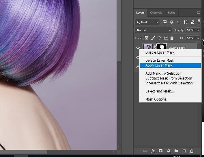 복사 된 레이어의 레이어 마스크를 마우스 오른쪽 버튼으로 클릭하고 "레이어 마스크 적용"을 클릭하십시오.