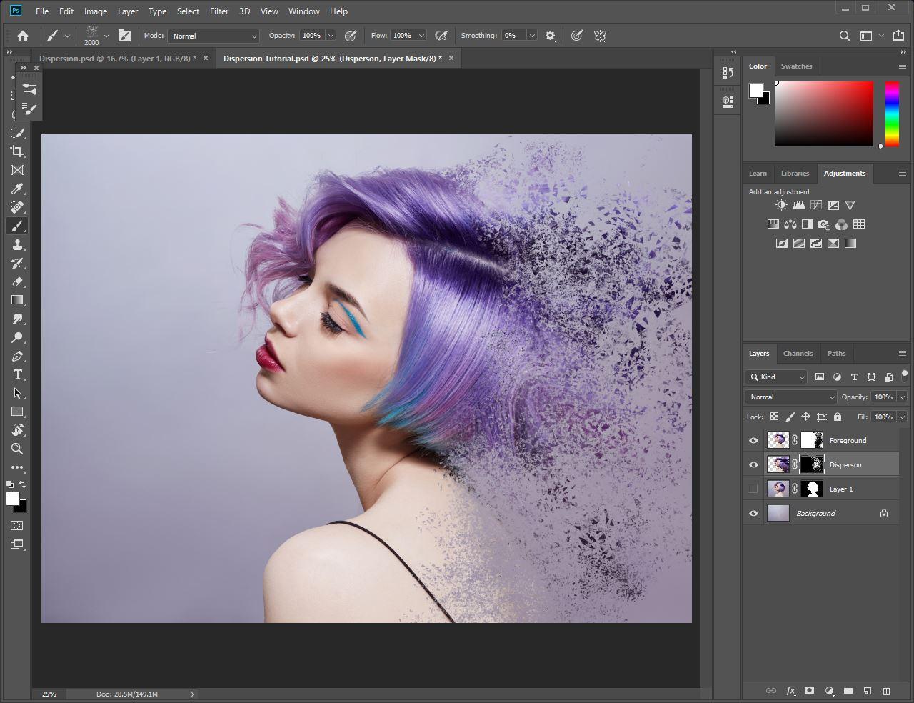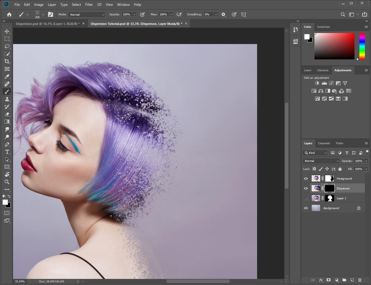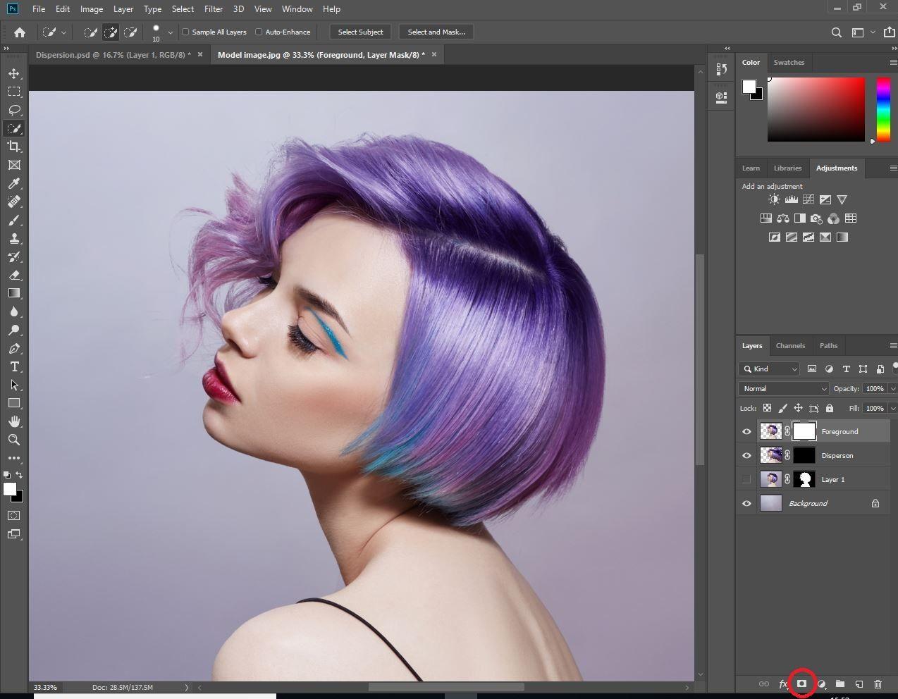 다음으로 Dispersion 레이어를 선택한 상태에서 키보드에서 Alt (또는 Mac의 경우 Option)를 누른 상태에서 레이어 패널 아래쪽에있는 마스크 버튼을 클릭합니다. 분산 레이어를 숨기거나 숨 깁니다.