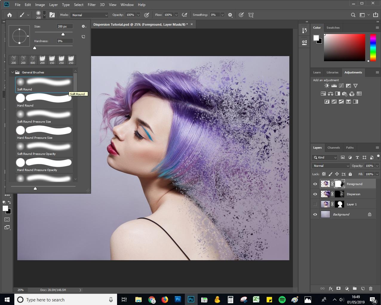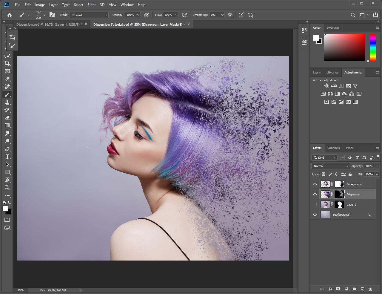 '분산'레이어에서 흰색 브러시를 사용하여 입자를 표시하고 검정색 브러시를 사용하여 입자를 숨 깁니다. '전경'레이어에서 흰색 브러시를 사용하여 피사체의 가장자리를 숨기고 검정색 브러시를 사용하여 가장자리를 나타냅니다.