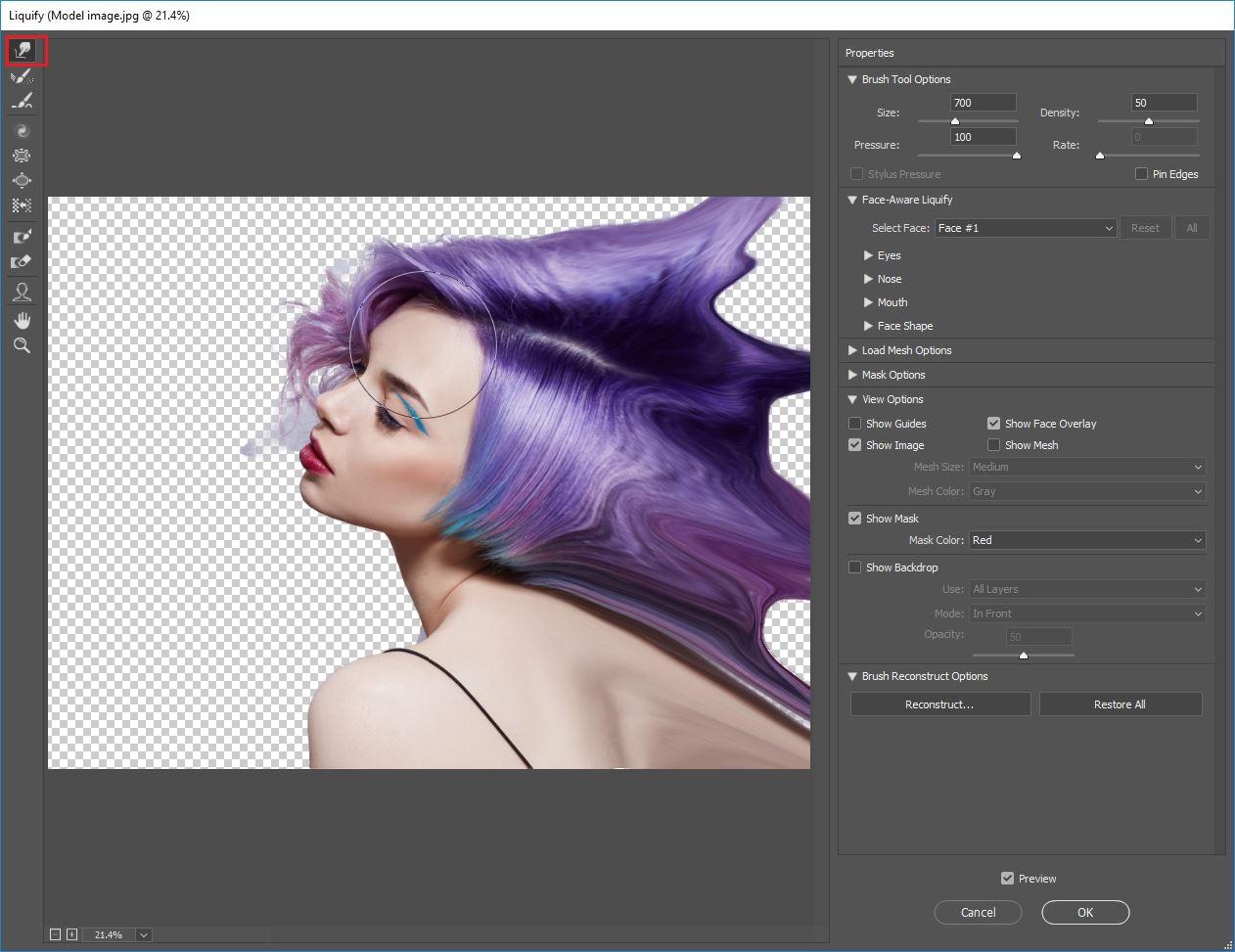 앞으로 변형 도구 (왼쪽의 첫 번째 옵션)를 사용하여 분산시키려는 이미지 영역을 끕니다.