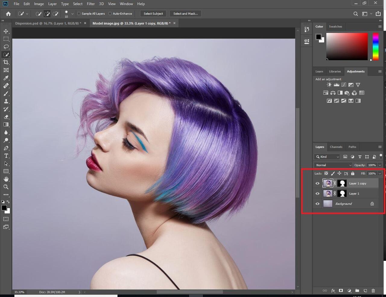 이제 레이어 패널에서 새 레이어를 선택하십시오. 그런 다음 왼쪽의 도구 메뉴에서 빠른 선택 도구를 사용하여 이미지의 전체 주제를 선택하십시오.