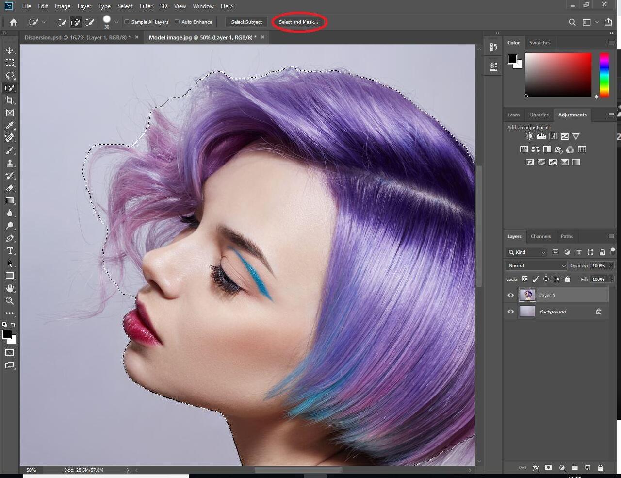 선택에 만족하면 상단에있는 선택 및 마스크를 클릭하십시오. 이전 버전의 Photoshop을 사용하는 경우 가장자리 다듬기를 클릭하십시오.