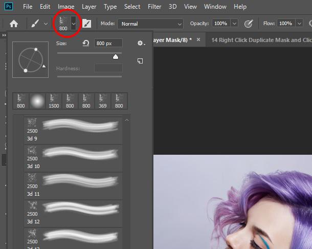 전경 마스크를 선택한 상태에서 브러시 도구를 클릭하고 브러시 패널에서 분산 브러시를 선택하십시오. 브러시 팩을 아직 설치하지 않은 경우 설치할 수 있습니다.