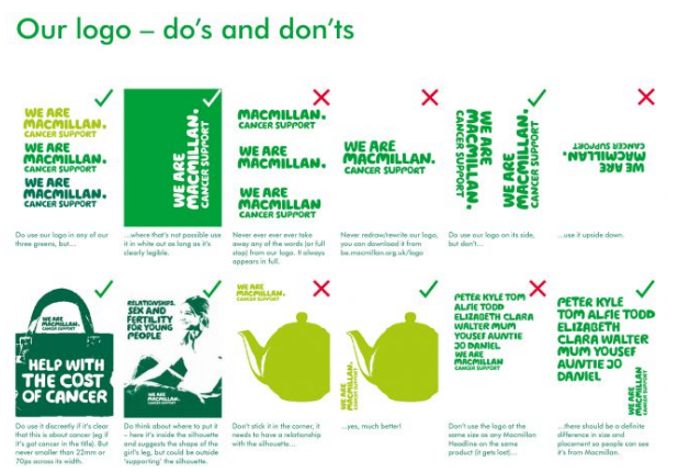 Cancer charity Macmillan's identity design guide covers for everything from signage to infographics, as well as tips on how to use the brand's familiar green colours and which photos are best used as the image silhouettes you'll find in the charity's marketing material. Unlike many of the style guides on this list, Macmillan offers explanations for many of its rules, to explain the thinking behind them and help fix them in readers' minds.