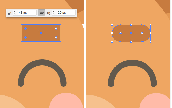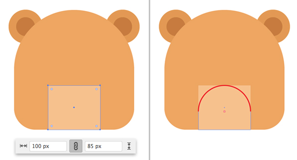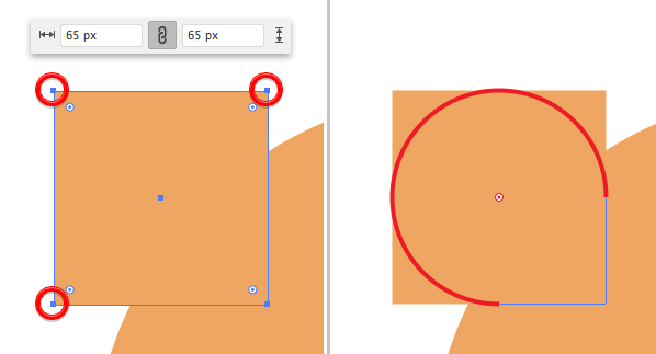 이제 귀를 만들어 봅시다. 사용 사각형 도구 (M)를 a를 위해 65 X 65 픽셀의 사각형. 사용을 직접 선택 도구 (A)를 모두 왼쪽 지점과 오른쪽 상단 앵커 포인트를 선택하고 사용하는 라이브 코너가 완전히 둥근 이러한 점을하도록되어 있습니다.