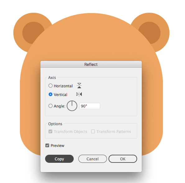 귀를 선택하고 더블 클릭 도구를 반영 (O)를 . 세로 축 위로 도형을 뒤집고 복사를 클릭 합니다. 두 번째 귀를 머리의 반대쪽에 놓습니다.