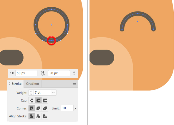 테이크 직접 선택 도구 (A)를 하고, 원의 하단 지점을 선택합니다. 눈에 반원을 만들 려면 Delete 키를 누르십시오.
