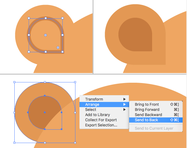 도형을 복사 (Control-C) 하고 붙여 넣기 (Control-F)합니다. 사본을 더 작게 만들고 진한 갈색으로 채 웁니다. 바닥 모양도 약간 어둡게 만듭니다.