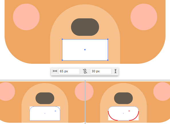 이제 입으로 넘어 갑시다. 사용 사각형 도구 (M)를 a를 위해 65 X 30 픽셀 흰색 사각형을. 사용 라이브 코너가 상단을 만들기 위해 기능과 아래의 그림과 같이 하단 모서리, 웃는 입 형성, 반올림.