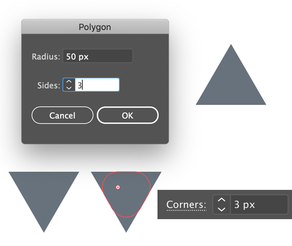 삼각형을 뒤집어 놓고 직접 선택 도구 (A) 를 사용하여 라이브 코너 의 원 마커를 당기 거나 제어판의 값을 수동으로 설정하여 코너를 약간 둥글게 만듭니다 . 모서리 값을 3px로 설정했습니다 .