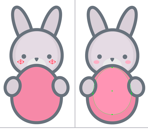 토끼의 모든 요소에 더 많은 세부 사항을 추가하십시오 : 뺨의 분홍색 타원형, 계란의 밝은 타원, 하이라이트의 귀 및 발 및 계란의 밝은 분홍색 반점은 더 복잡해 보입니다.