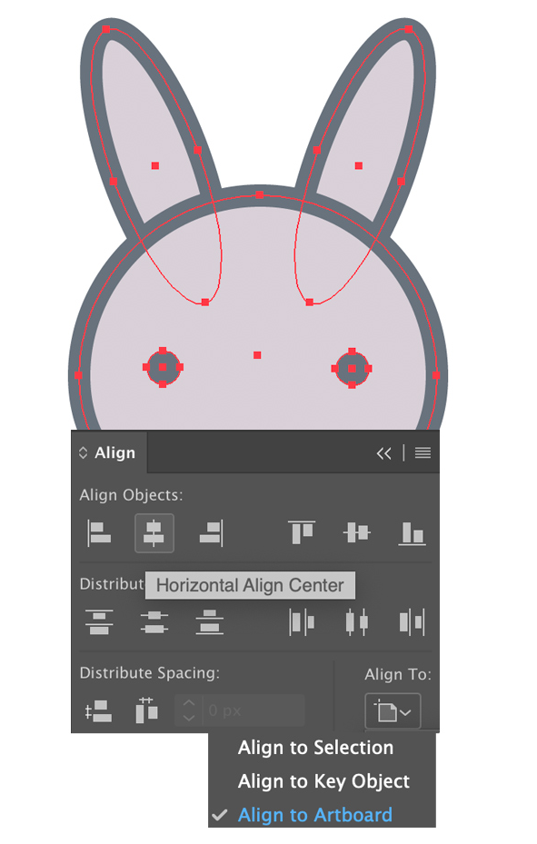 양쪽 귀를 그룹화 (Control-G) 하고 모든 객체를 선택 하고 정렬 패널 (창> 정렬) 에서 수평 정렬 센터 를 클릭하여 모든 것이 완벽하게 중앙에 배치되도록 합니다.