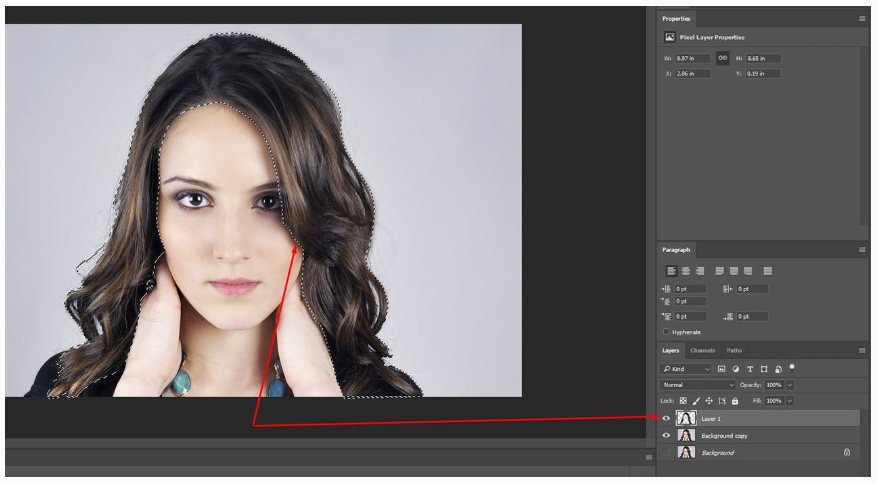 위에서 설명한대로 Photoshop에서 모발 선택을 수행 한 후 다음 단계를 유지하십시오.