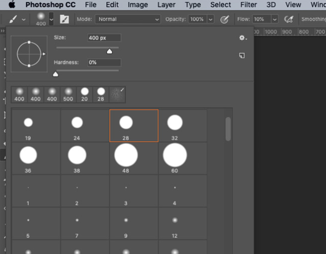 브러시 도구를 선택하고 팁을 경도가 0보다 훨씬 큰 크기로 변경하십시오.