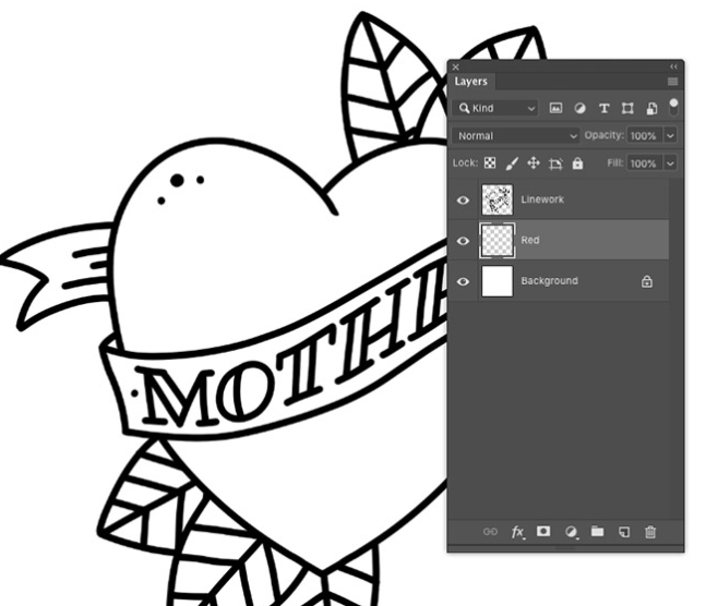 디자인에 색상을 적용하기 위해 각 색조에 별도의 레이어가 적용됩니다. 선 작업 도면층 아래에 새 도면층을 추가하고 참조 할 이름을 지정합니다.