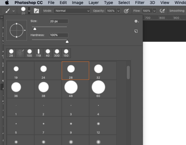 Adobe Photoshop을 열고 새 문서를 만듭니다. 약 2000x2000px의 캔버스 크기로 작업하고 있습니다. 경도 값을 100 %로하여 선 작업 너비 (필자의 경우 20px)에 적절한 크기의 팁으로 브러시 도구를 설정합니다.