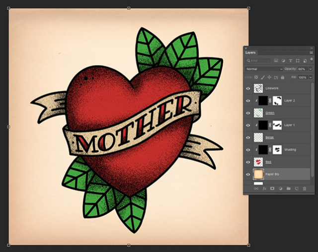 디자인이 풀 컬러 및 음영 처리되면 빈티지 문신 플래시 드로잉의 모양을 제공하는 마무리 터치로 오래된 종이 질감 을 배경 에 추가합니다 . CMD + T 바로 가기를 사용하여 이미지를 캔버스에 맞게 크기를 조정 한 다음 불투명도를 변경하여 돌출을 줄입니다.