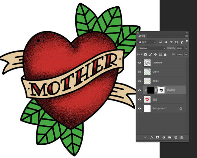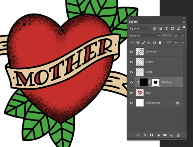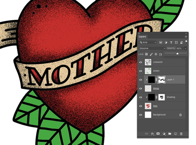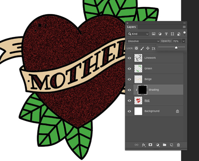 음영 처리 레이어에 레이어 마스크를 추가 한 다음 마스크 내에서 검은 색으로 페인트하여 음영 처리 레이어를 지 웁니다. Dissolve 혼합 모드는 브러시의 부드러움으로 인해 결이 희미 해집니다. 브러시가 클수록 입자가 점차 서서히 퇴색됩니다.