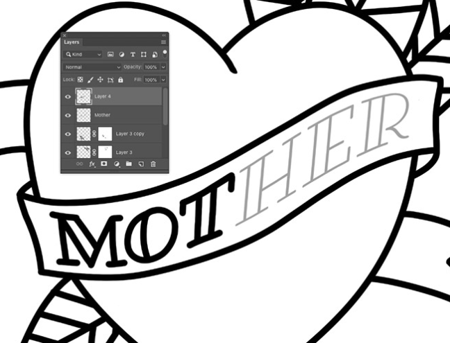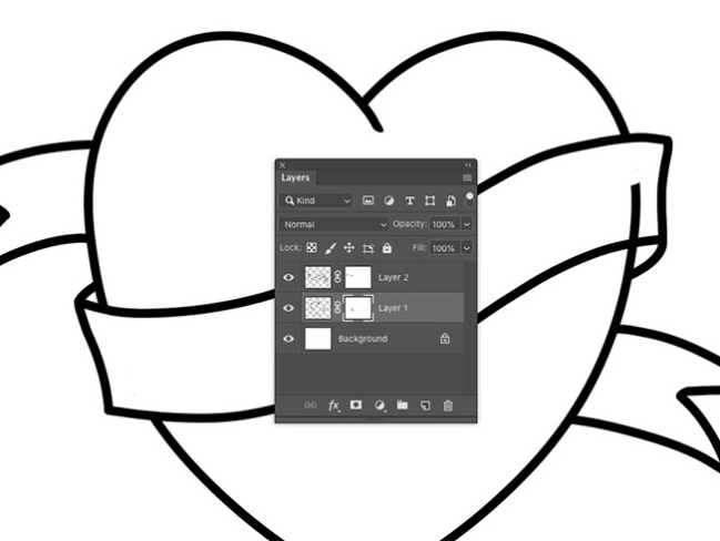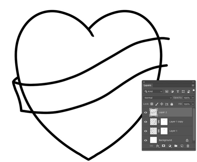 하트 모양을 형성하는 두 개의 윤곽선을 하나의 레이어로 병합 한 다음 레이어 마스크를 적용하고 배너와 겹치는 선을 지 웁니다.