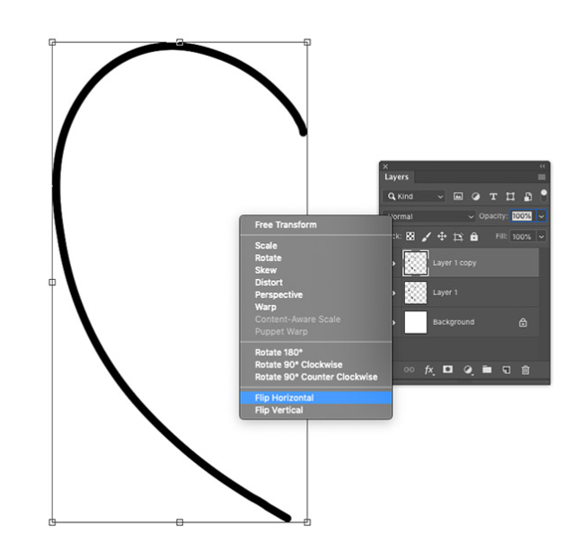 CMD + J 바로 가기를 사용하여 레이어를 복제 한 다음 CMD + T를 눌러 변형합니다. 마우스 오른쪽 버튼을 클릭하고 수평으로 뒤집기를 선택하여 다른면과 동일한 선을 만듭니다.