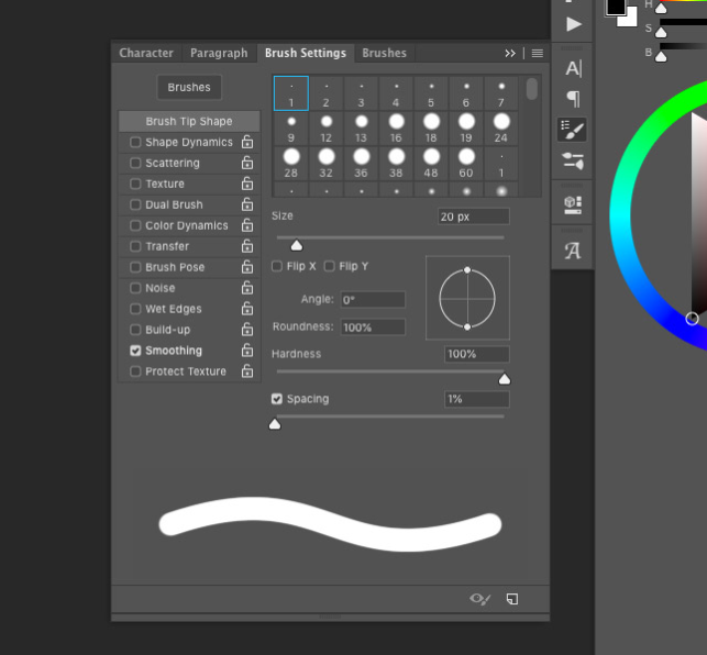 브러시 설정에서 간격을 1 %로 줄인 다음 다듬기 옵션을 확인하십시오. 펜 태블릿을 사용하면 디자인을 훨씬 더 자연스럽게 표현할 수 있지만 마우스를 사용하여 그릴 수 있습니다.