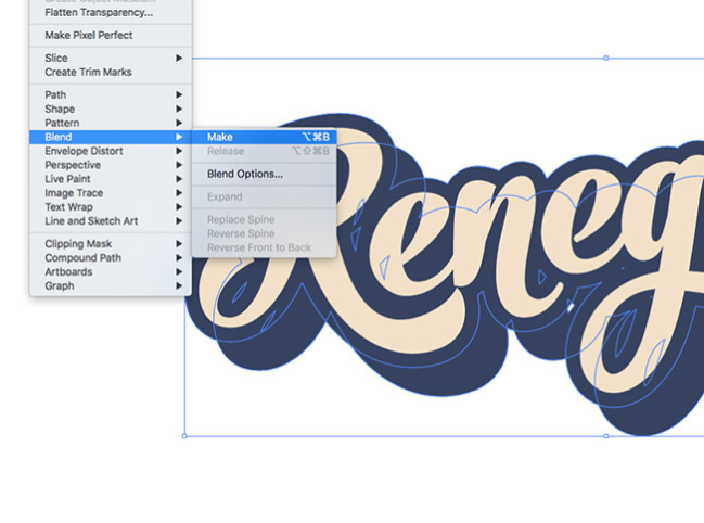 파란색 윤곽선 만 선택한 다음 복사 (CMD + C) 및 붙여 넣기 (CMD + B)를 누르십시오. Shift 키를 누른 상태에서 복제본을 위아래로 움직입니다. 두 파란색 모양을 모두 선택한 다음 Object> Blend> Make 메뉴에서 블렌드를 만듭니다.