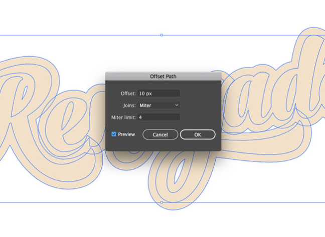 객체> 경로> 오프셋 경로로 이동하고 10px를 입력하여 유형 주위에 더 넓은 윤곽선을 만듭니다. 이 새로운 개요에 # 374160의 진한 파란색 채우기 색을 지정하십시오.