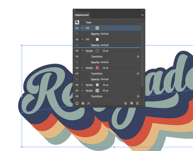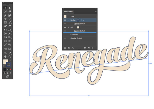 이 방법에 대한 모든 작업을 수행 할 모양 패널이 표시되는지 확인하십시오. 밝은 베이지 색조 (# f3e1c8)로 채우기를 변경 한 다음 진한 파란색 외곽선 색상 (# 374160)을 획으로 적용하십시오. 기본적으로 획은 채우기 위에 나타나므로 각 문자의 윤곽을 볼 수 있습니다. 이 획을 모양 패널의 채우기 아래로 드래그하십시오.