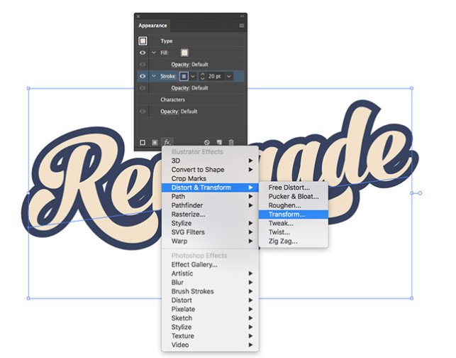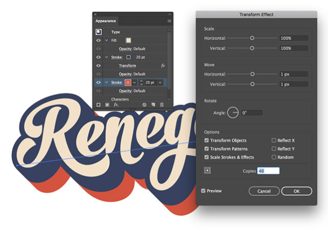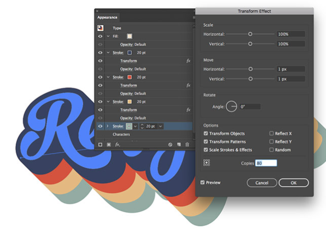 스트로크 오프셋을 20pt로 늘리면 앞서 오프셋 경로와 동일한 효과가 나타납니다. 블렌드를 모방하기 위해, 대신 Appearance 패널 하단의 FX 메뉴에서 Transform 효과를 사용할 수 있습니다.