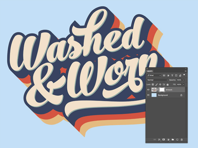 이미지 텍스처를 사용하기 위해 제가 선호하는 기술은 Adobe Photoshop의 레이어 마스크를 사용하는 것입니다. 비파괴 적으로 아트웍을 지우므로 필요한 경우 텍스처를 되돌릴 수 있습니다. 레이어 패널 아래쪽에있는 레이어 마스크 아이콘을 클릭하여 아트웍 레이어에 마스크를 추가합니다.