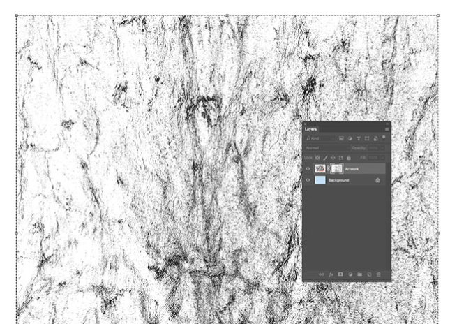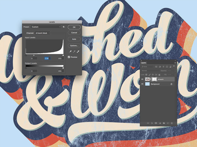 레이어 축소판을 클릭하여 마스크에서 나가면 아트웍에 적용되는 텍스처를 볼 수 있습니다. 텍스처의 레벨을 변경하여 효과의 강도를 조정할 수 있습니다. 레이어 패널에서 마스크 축소판을 선택한 다음 CMD + L을 눌러 레벨 창을 엽니 다. 그림자, 중간 톤 및 밝은 영역 슬라이더를 조정하여 텍스처의 대비를 변경하십시오.