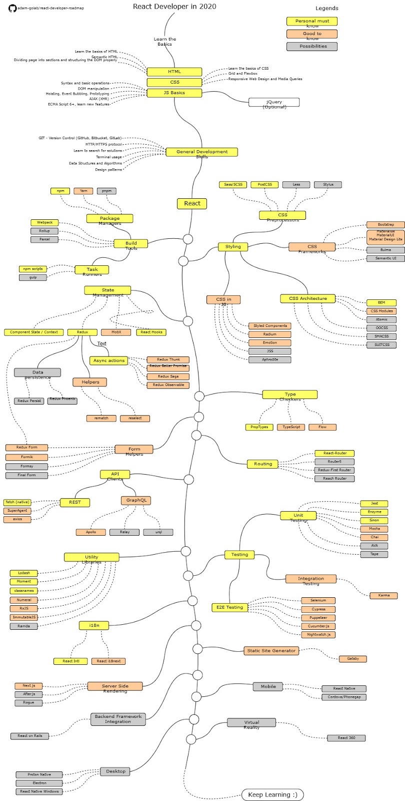 관한 모든 것. 실제로 매우 포괄적이지만 이미 많은 것들을 알고있는 좋은 기회가 있습니다. 모르더라도이 로드맵에 의해 두려워하거나 압도 할 필요는 없습니다. 작게 시작한 다음 따라갈 수 있습니다. React Developer가되는 길은 많습니다. 당신이 이미 알고 반작용 경우에, 당신은 분명히 당신의 고양이에 추가하고, 심지어 더 나은 2020에서 개발자 반작용이 될 몇 가지 더 많은 도구와 기술을 찾을 수 있습니다