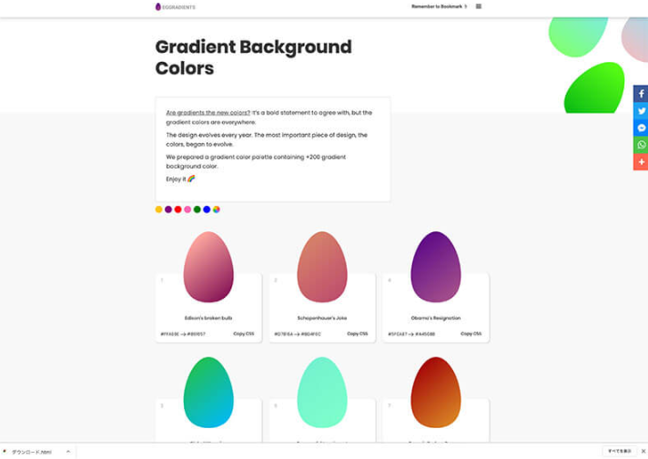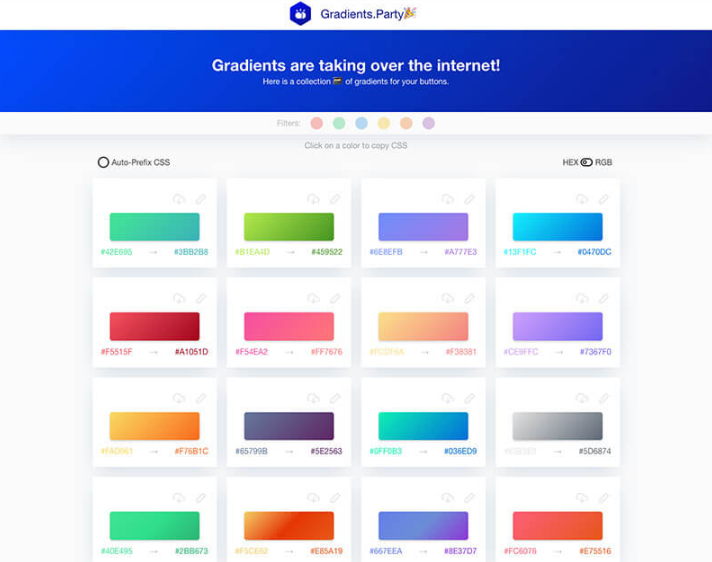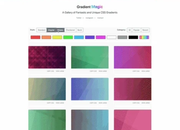200 개 이상의 웹 디자인 제작에 최적의 그라데이션이 모여, 모두 버튼 하나로 CSS를 복사 할 수있는 우수한 것. 색상별로 검색 할 수 있습니다.