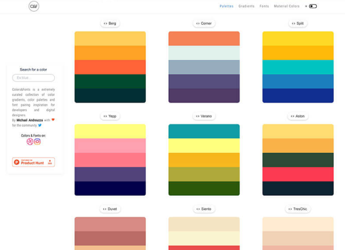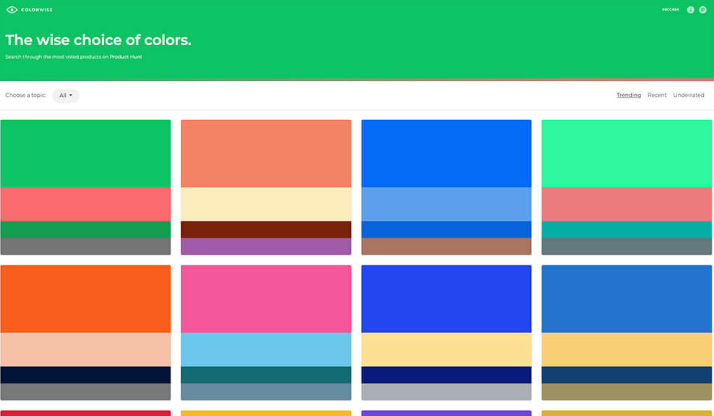 모바일 앱과 웹 도구 등 최신 기술 관련 제품 정보 나 사용자 리뷰 등을 체크 할 수있는 Product Hunt 에 등장한 아이템의 배색 컬러 팔레트를 모으고 있습니다.