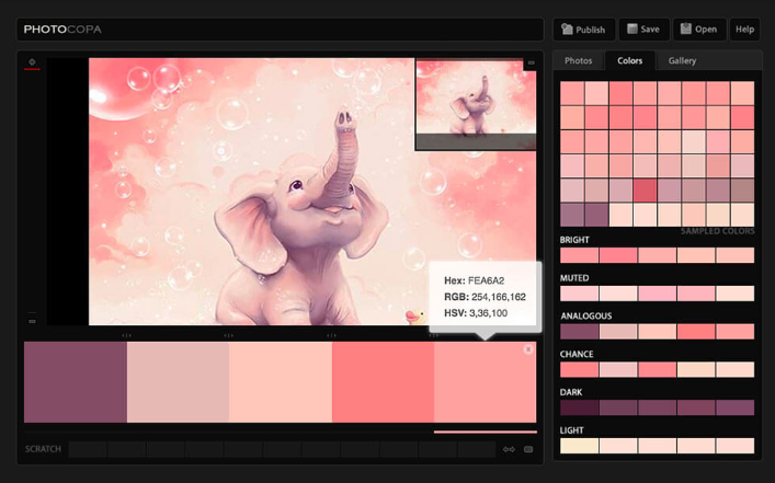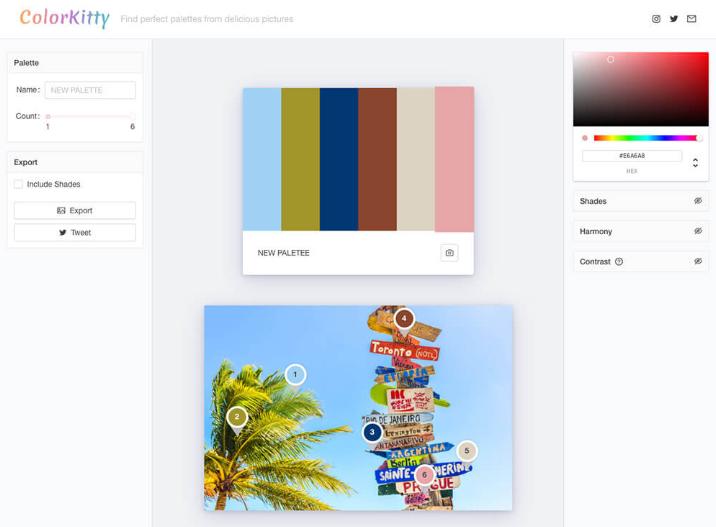 사진을 업로드하면 자동으로 색상을 추출하고 아름다운 컬러 팔레트를 만들어주는 웹 도구. 선택된 색상은 이미지에서 드래그하면서 이동하여 수동으로 색상을 선택할 수 있습니다.