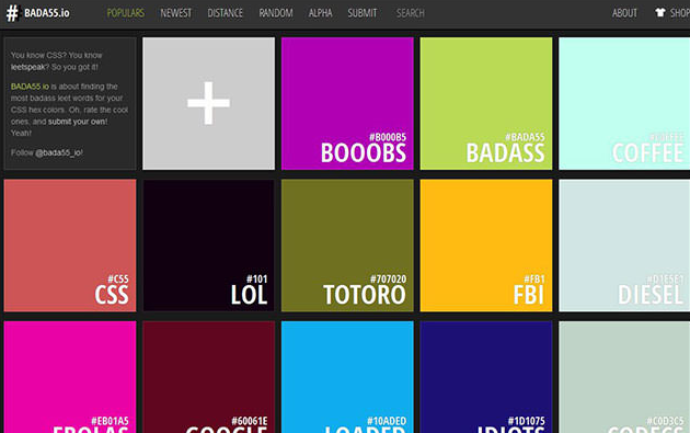 알파벳과 숫자를 사용하여 표시되는 독특한 단어 (영어 : leet )의 배색 컬러 팔레트를 모으고있는 사이트. 참고 사이트 이름 Bada55는 "Badass (우리의 나쁜 근사)"를 의미합니다.