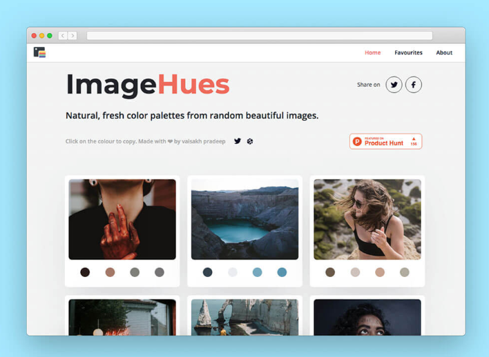프리 스톡 사진 사이트 Unsplash에서 선택 된 사진의 색상 팔레트를 표시하고 클릭 #HEX 컬러 코드를 복사 - 붙여 넣기 할 수 있습니다.