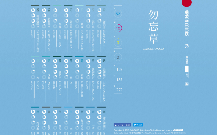 일본 독자에게 전해지는 전통의 색상을 디자인 제작에 활용하고 싶을 때는 여기의 사이트를 추천한다. 보기 쉬운 컬러 차트에 아름다운 애니메이션이 멋진 도구.
