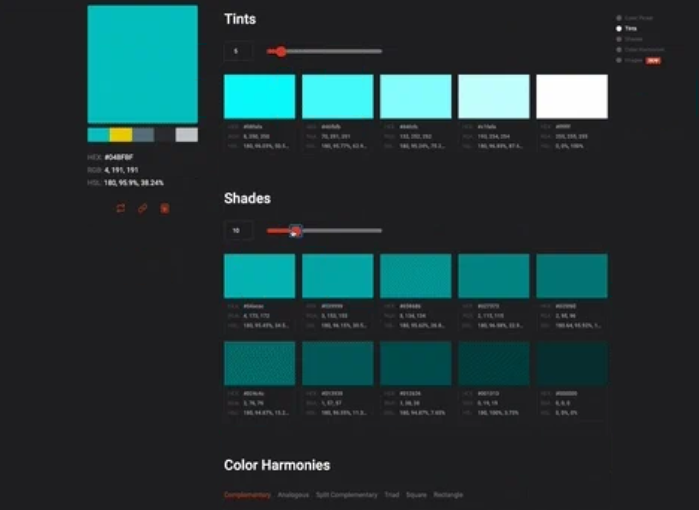 원하는 색상을 선택하면 단색 흰색을 섞은 색 "틴트 (영어 : Tint) '와 단색 검정을 섞은 색"쉐이드 (영어 : Shade)'을 단계적으로 생성 할 수있는 도구입니다.