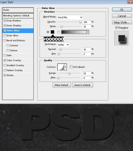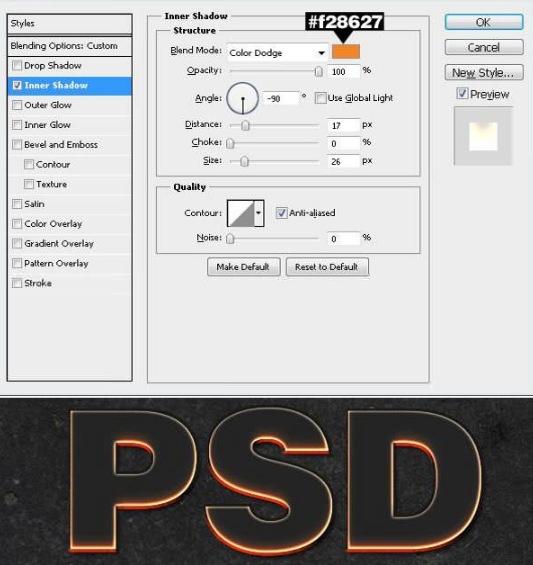 설정을 마친 문자 레이어를 복제하고 레이어 팔레트에서 마우스 오른쪽 클릭> "레이어 스타일 지우기"를 선택합니다. 이에 따라 적용되는 모든 레이어 스타일이 해제됩니다. 새 레이어 스타일을 추가하기 위해 메인 메뉴에서 '레이어'> '레이어 스타일 "을 선택하고 다음과 같이 설정합니다.