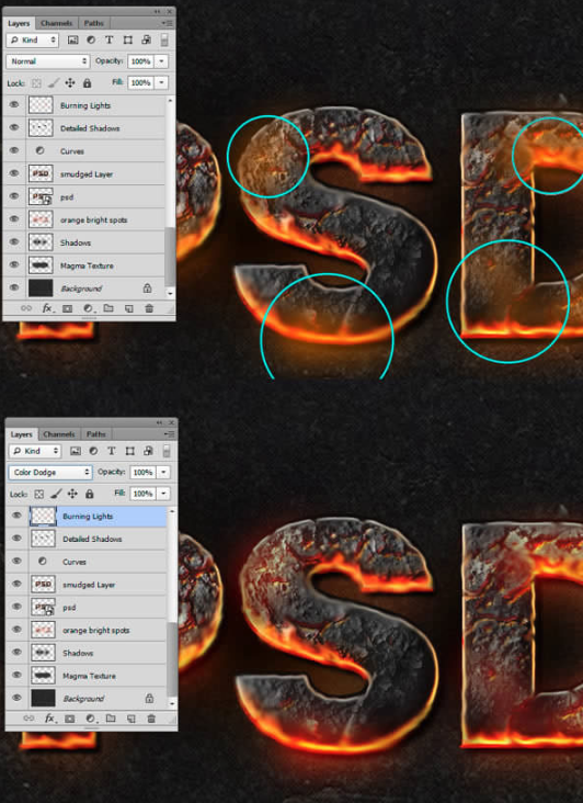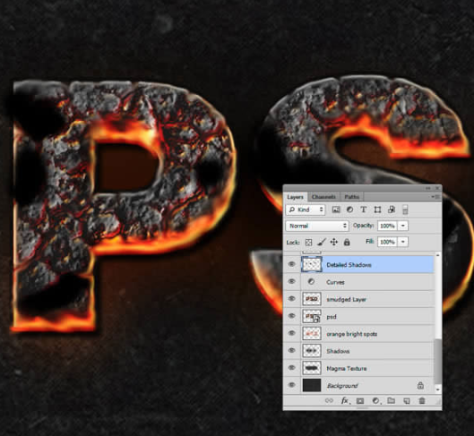 레이어 스타일을 잘 설정하고 다양한 그리기 모드를 구사하는 것으로, 리얼한 마그마 문자를 완성할 수 있습니다. 또한 브러시 도구를 이용한 입체감 있는 그림자, 하이라이트를 표현하는 기법도 도움이 될 것 같아요.