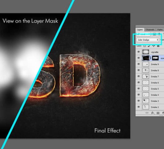 메인 메뉴에서 '레이어'> '레이어 마스크 ">"모든 영역 숨기기 "를 적용합니다. 계속 도구 상자에서 "브러쉬 도구"를 선택하면 전경색 "흰색"소프트 브러시로 텍스트 주변의 레이어 마스크를 제거하고 갑시다. 이제 진짜 똑같이 불꽃이 튀는 마그마 텍스트의 완성입니다.