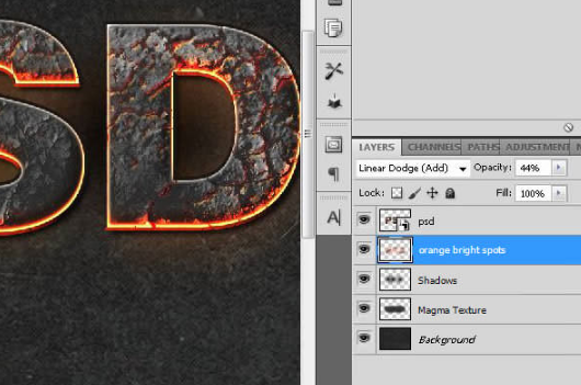 또한 새 레이어를 만들고 오렌지 소프트 브러시에서 방금 되짚어 텍스트 주위를 다시 페인트 갑시다. 마지막으로 레이어의 혼합 모드를 "선형 닷지 () - 가산"불투명도 "44 %"로 변경합시다. 이로 인해 불길이 배경에 반사된 같은 이펙트를 추가할 수 있습니다.